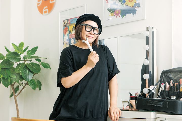 トレンド感のあるメイクで常に第一線で活躍する凄腕ヘアメイクさん。「ウェイビー ミニは、気になる部分に当てているだけでも効果があるので、メイクの後にも使えるのがいいんです!長時間の撮影でも肌疲れが防げるので、助かります。トルネードローラーでの物理的な刺激とEMSでの繊細な電気刺激の合わせ技で、小さいのに頼れる1台。首筋からしっかり流すと、フェイスラインがすっと浮き出てくるので、ここぞというときのケアにもおすすめです」
