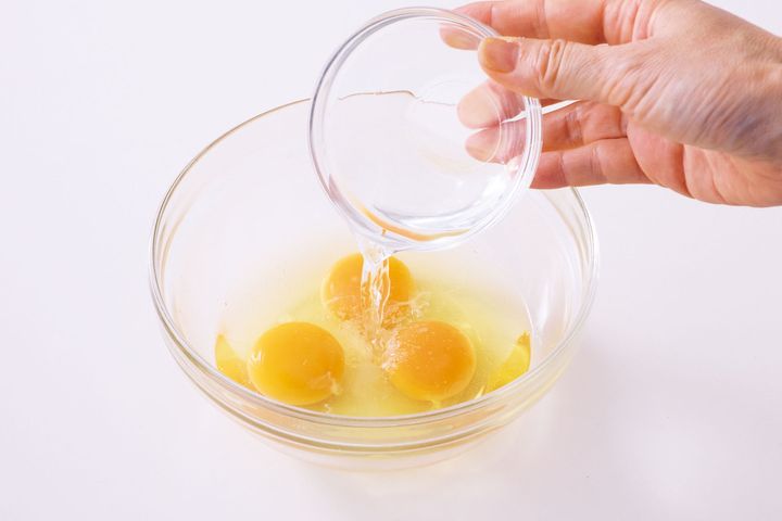 卵に水を加えて溶くことで、火の通りがゆるやかになり、口当たりよく仕上がります。また、余熱でも火が通るので、卵がふんわりと固まったら、早めに器に取り出すようにして。