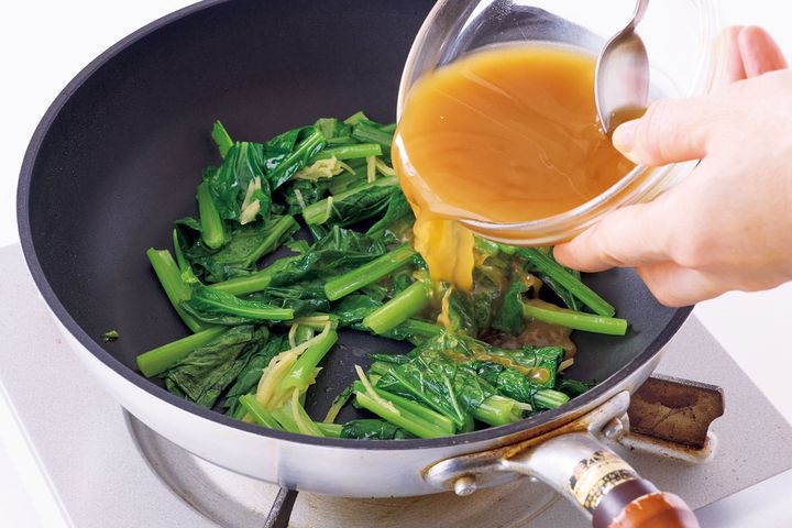 (2)フライパンにごま油大さじ1を強めの中火で熱して卵液を流し入れ、大きく混ぜながら炒めて器に取り出す。フライパンにごま油大さじ1/2をたして強めの中火で熱し、小松菜、しょうがを入れてさっと炒める。〈A〉をもう一度よく混ぜてから加え、中火にして混ぜながらとろみをつけ、卵にかける。