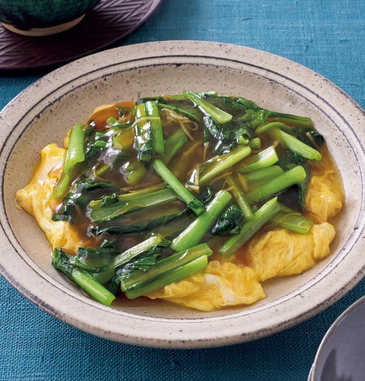 3. 【価格安定の小松菜×卵で晩ごはん】『ふんわり卵の小松菜あんかけ』の節約レシピ