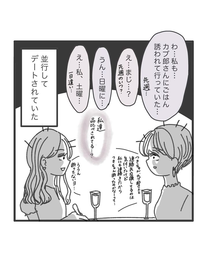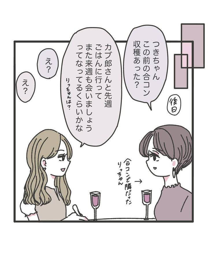 カブ郎さんと連絡先を交換し、さっそく食事に出かけたOLつきなさん。後日、合コンで隣の席だったりっちゃんから「収穫あった?」と聞かれ、カブ郎さんのことを伝えます。すると、りっちゃんも一日違いでカブ郎さんと食事に行っていたことが発覚!デートを並行されていた事実を知り、ショックを受けるのでした…!