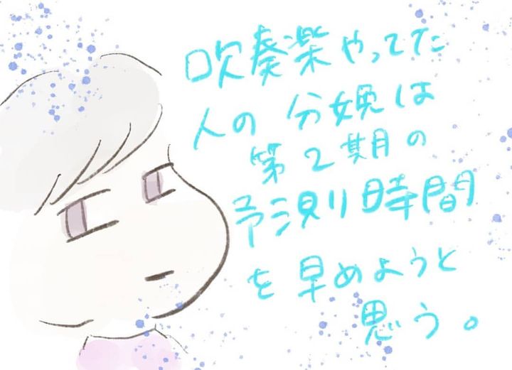 いきむのが上手な妊婦さんだったようで、あっという間に赤ちゃんが誕生! おたんこ助産師さんが「上手すぎてびっくりしましたー」と言うと、妊婦さんは「吹奏楽をやっていた時のトランペットを吹く感じに似てたんです」とひと言。それに対し、おたんこ助産師さんは心の中で「吹奏楽やってた人の分娩は第2期の予測時間を早めよう」と思ったのでした。