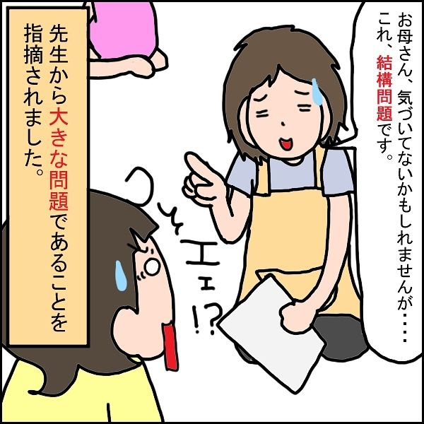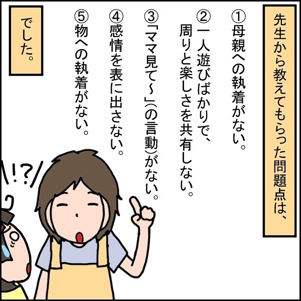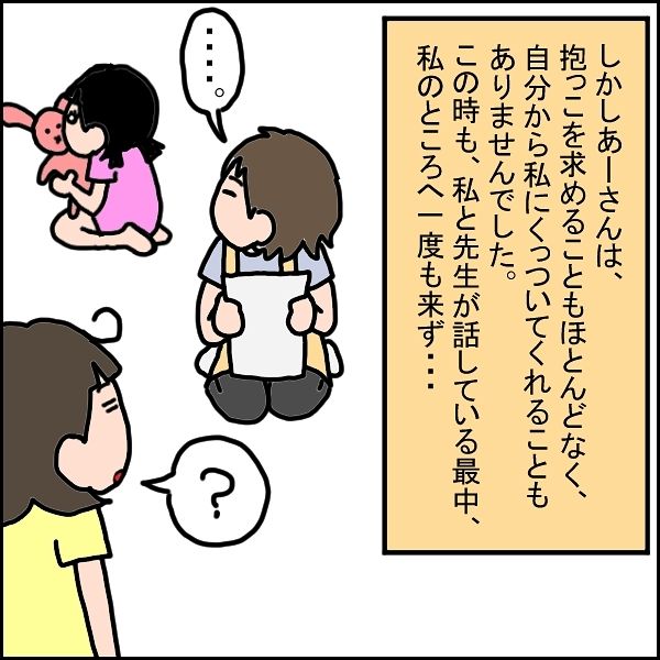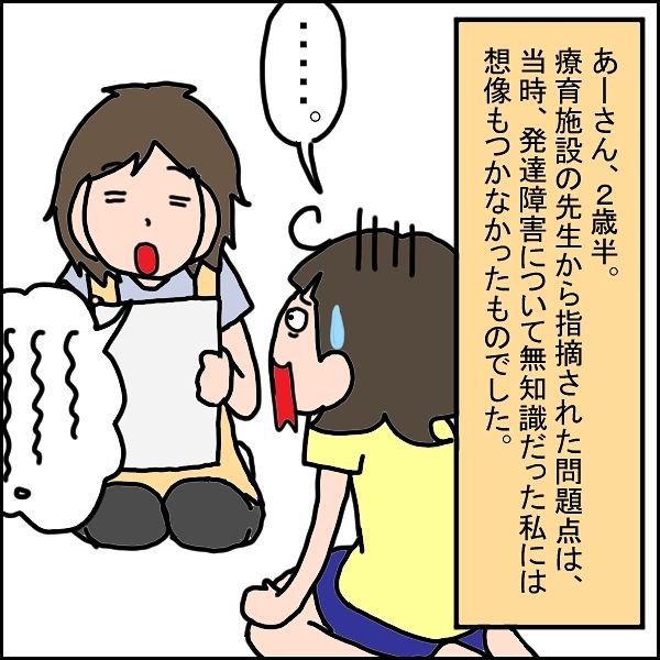 あーさんを療育施設に連れて行くと、初日の面談で、さまざまな問題点を指摘されることに。母親への執着がないこともその一つで、「お母さん、気づいてないかもしれませんが…これ、結構問題です」と指摘されるのでした。