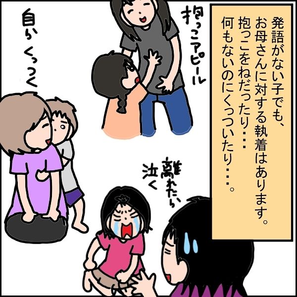子どもの発達に詳しくないと、母親に執着がなくても、「そういうものか」と考えてしまうかもしれません。面談を通して、さまざまな問題点に気づく療育施設の先生はさすがですね。