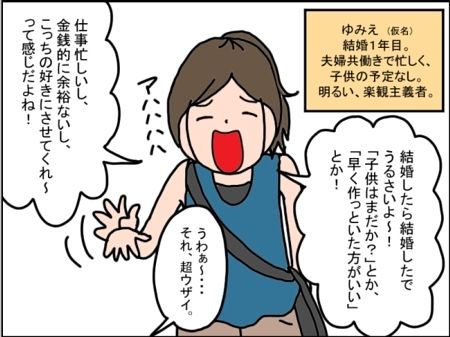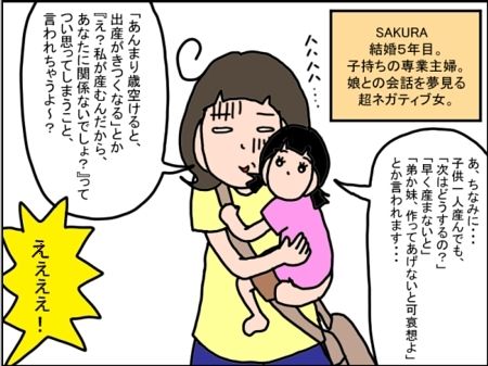 久々に友人と会ったところ、「彼氏は出来たか?」「結婚はまだか?」「子供はまだか?」など、それぞれが、こうした言葉を鬱陶しく感じているようです。子どもを一人出産したSAKURAさんもまた、「次はどうするの?」と、余計なお節介を受けているのでした。