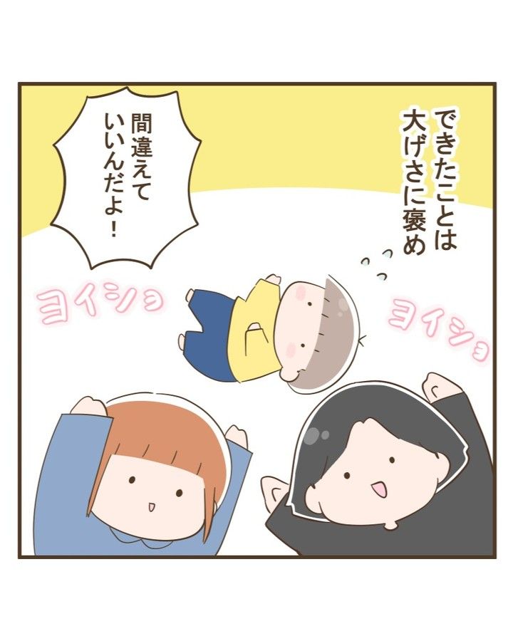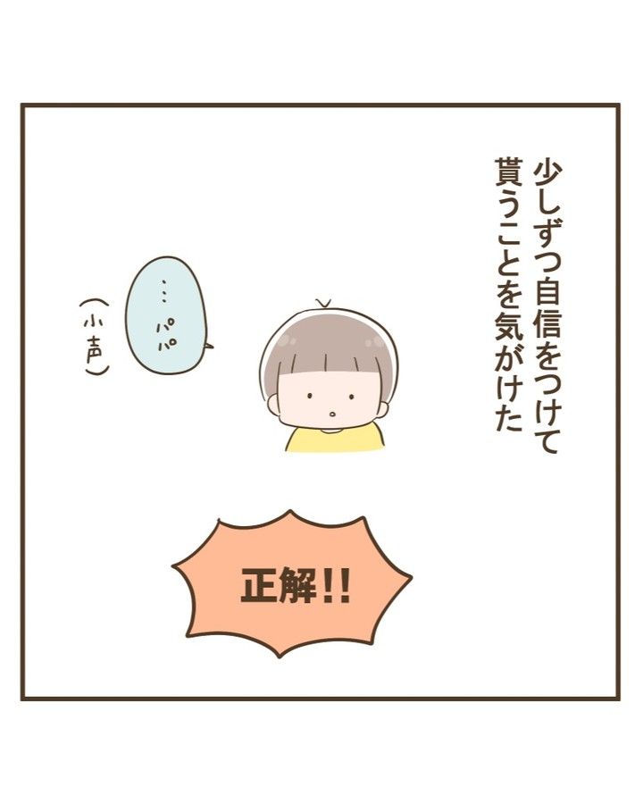 ぷにくんの言葉の発達がゆっくりなことを気にしていた、うみの まちさん。「どっちがパパでしょう?」という問いに答えようとしないぷにくんの様子を見て、「自信をなくしてるからじゃない?」と、夫・ふくちゃんがつぶやきます。それ以来、できたことに目を向け、しっかり褒めることを心がけたそうです。