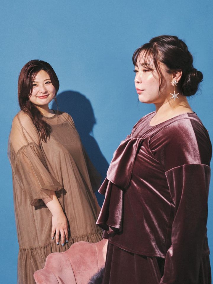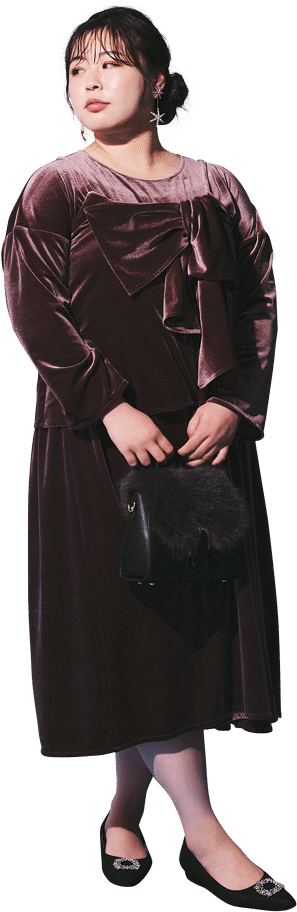 ベロアキャミ&ワンピースセット 3(15-17号相当)、5(19-21号相当)¥19,580/アズ ノゥ アズ オオラカ(アズ ノゥ アズ) ビジューイヤリング ¥660/ラティス フェイクファー付き2WAYバッグ ¥17,600/ダイアナ(ダイアナ 銀座本店) ビジューフラットパンプス 22~26cm、(以下WEB限定)21.5、26.5cm ¥7,7 00/オリエンタルトラフィック(ダブルエー)