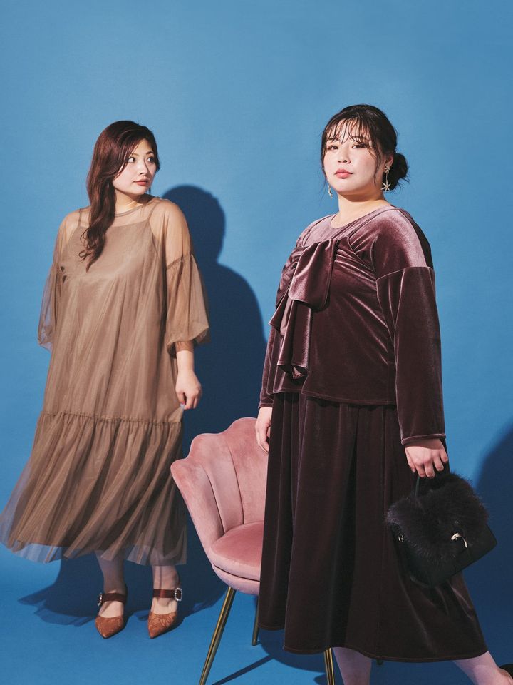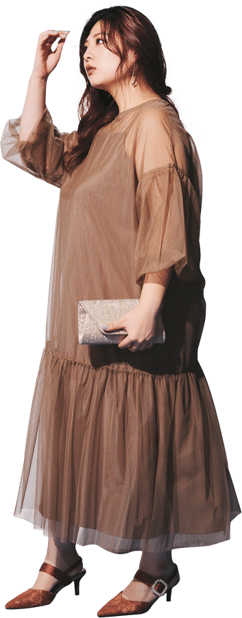 チュール&キャミワンピースセット フリーサイズ(L-4L相当)¥18,900/MI AND MOU イヤリング ¥2,750/コトモノマルシェ ルミネエスト新宿店 パイピングクラッチバッグ ¥8,800、バックストラップレースパンプス 22~26cm ¥8,800/共にオリエンタルトラフィック(ダブルエー)