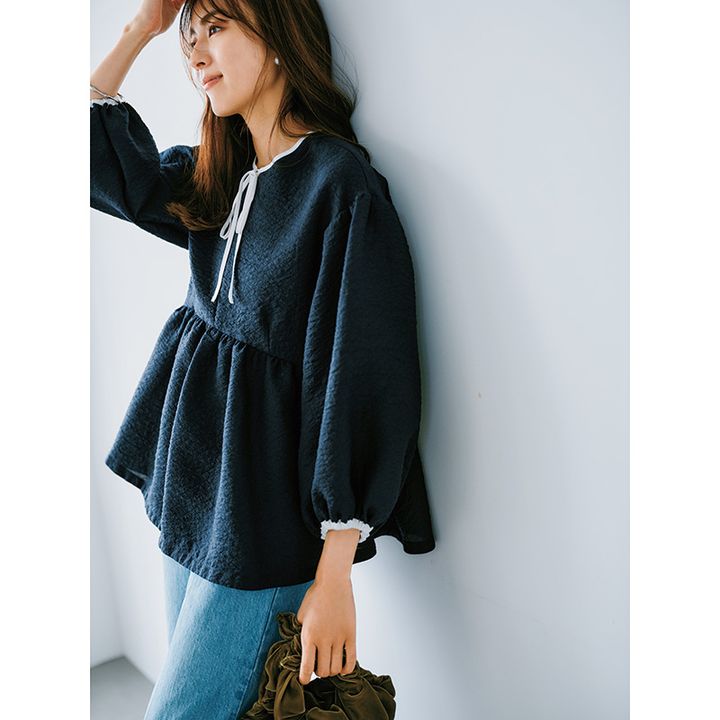 表情豊かなオーガンジージャカードに フロントリボンで甘さのある1枚。 デニム合わせでも品良くまとまる
