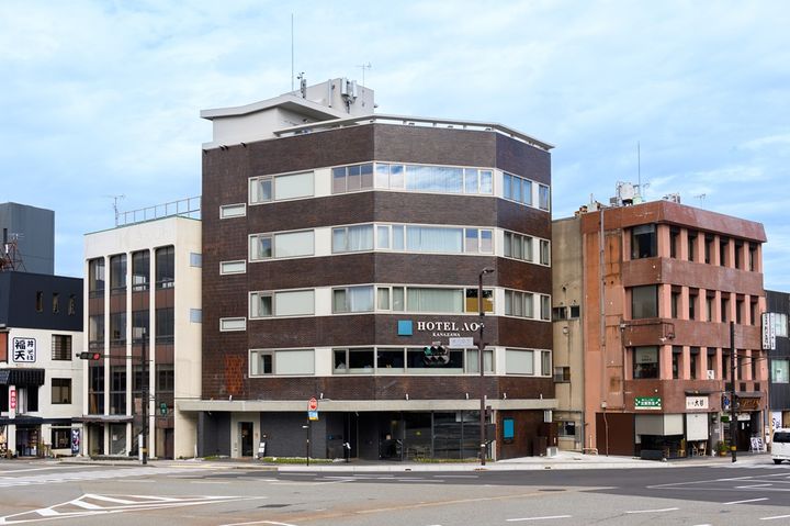 兼六園下交差点に面して建つHOTEL AO KANAZAWA。元は昭和41年(1966)に地元バス会社の北陸鉄道が建てた「北陸会館」の旧ビルとして親しまれてきました。60年近い歴史を刻んだ全面茶褐色のタイル張りの外観はそのまま生かし、地下1階、地上5階建てのホテルとして生まれ変わりました。