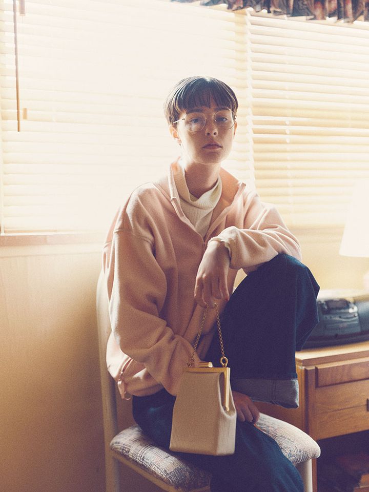 【POINT】ハーフジップのフリースの中にタートルをレイヤード。リラックスしたムードはそのまま、どこかきちんと見える絶妙な空気感を演出。タートルをくしゅっとたるませた適当な着方が、フリースの淡ピンクを甘く転ばせないポイント。