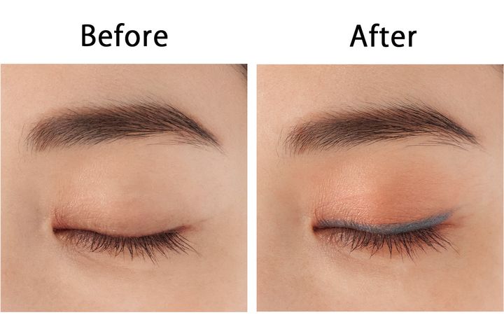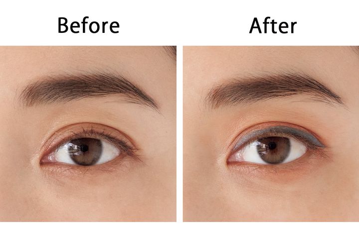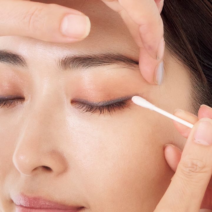 ②ラインの上側と目尻の下側を綿棒でスッとぼかすと、肌に馴染んで美しい仕上がりに。目元を軽やかに引き締めながら、華やかさもプラスされ新鮮な眼差しに。