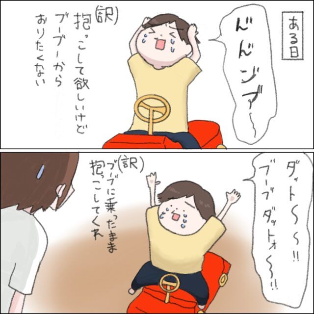 3. ブーブーにも乗りたいし抱っこもして欲しい。葛藤の末に息子が出した答えは「乗ったまま抱っこして」|ねむりひつじの子育て絵日記