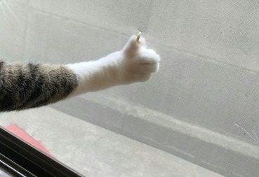 外を歩いている人たちを応援しているのか、その後ろ姿からたくさんの想像ができますね。この画像だけで話がものすごく広がるでしょう。猫ちゃんはちょっと爪がひっかかっているだけなのに、本当に見事なサムズアップです。
