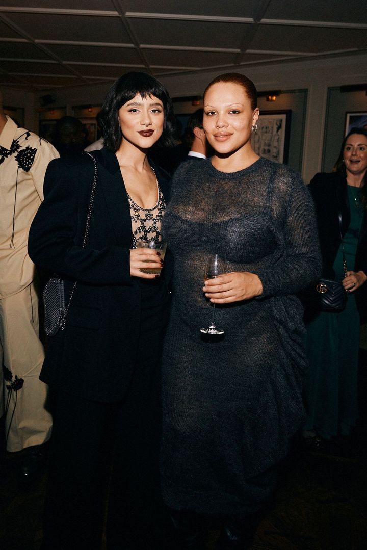 先日開催されたUK版『VOGUE』主催のパーティーでキャッチされた俳優のナタリー・エマニュエルとモデルのアルバ・クレアは、それぞれ洗練されたスタイルで来場。ナタリーは、マニッシュなミディ丈ジャケットを基調に、シンプルでありながら力強さを感じさせる装い。ビジューのトップスと煌めくバッグが華を添え、シックな中に目を惹く輝きをプラス。一方、アルバ・クレアはシースルーのニットドレスで、カジュアルとセンシュアルを巧みに融合。透け感のあるニットで官能的なムードを纏っているが、ヘアスタイルをスリークバックにまとめ、全体に落ち着きのある雰囲気を醸し出した。
