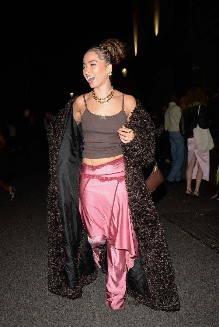 シンガーのエラ・エアは、パーティーシーズンにぴったりな光沢のあるスカートパンツを主役に、存在感抜群なロング丈のコートをコーディネートし、ハッピーなオーラを纏ったホリデースタイルを披露。胸もとの大きく開いたY2Kを想わせるキャミソールの時には、大ぶりのネックレスをプラスして、パーティーらしい輝きをプラスして。