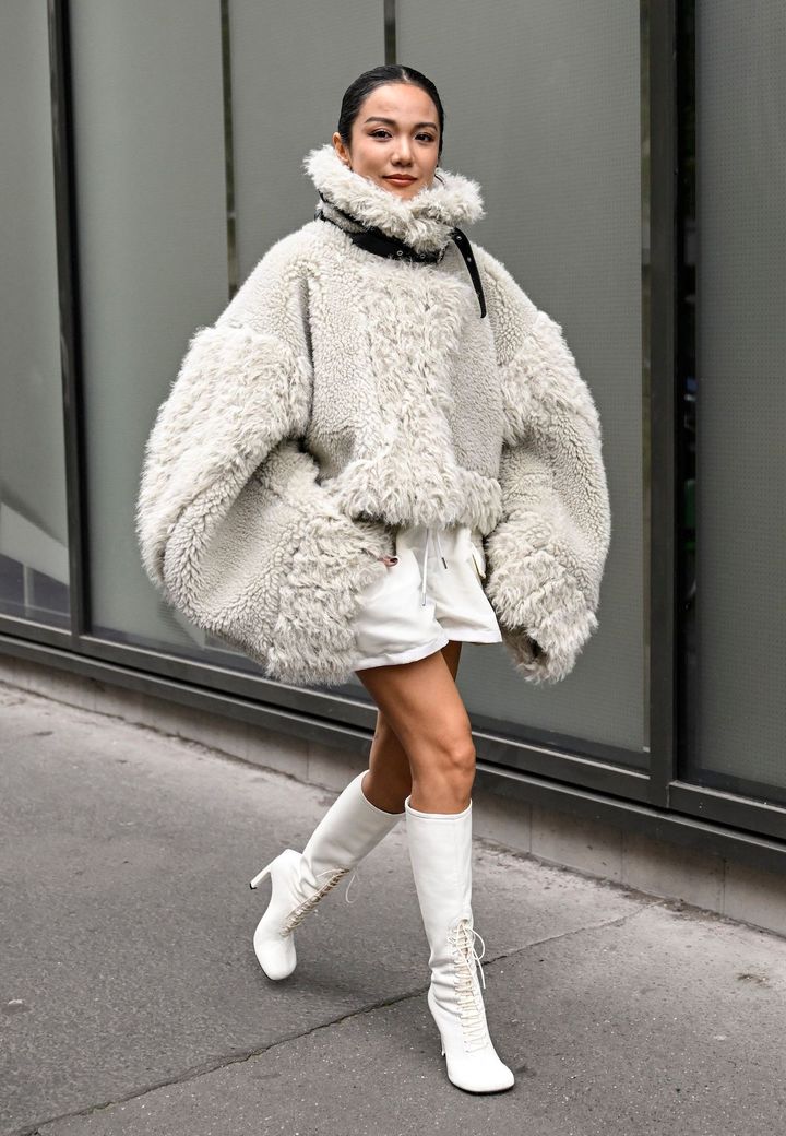 インフルエンサーのヨーヨー・カオは、チャンキースリーブが特徴的なサカイSACAI)のコートをチョイス。全身をホワイトでまとめたスタイリングは、知的なオーラを放つ。テクスチャーの異なるホワイトアイテムを巧みにレイヤードすることで、単調になりがちな冬のコーデに立体感をプラス。ボリュームのあるコートが主役として際立つ一方、ミニマルなボトムがモダンな印象を強調する。