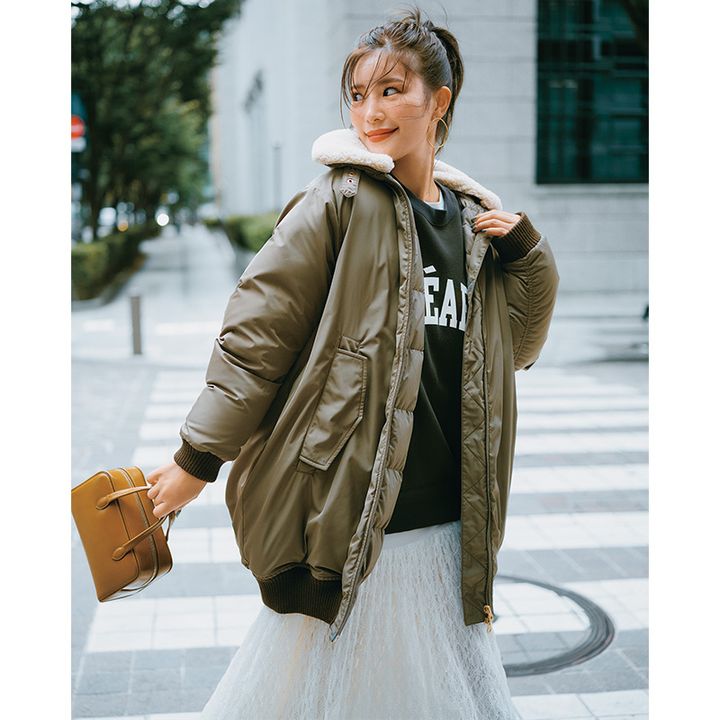 ボア衿の白がアクセントになり防寒と小顔効果を一挙両得。ダウンジャケット[衿元取り外し可能]¥159,500(デュベティカ/F.E.N.)スウェット¥16,500スカート¥22,000(ともにザ ポーズ/ウィム ガゼット 青山店)中に着たTシャツ¥25,300(ボーディ/アルファ PR)ピアス¥16,500(フィリップ オーディベール/トゥモローランド)バッグ¥31,900(トゥティエ)