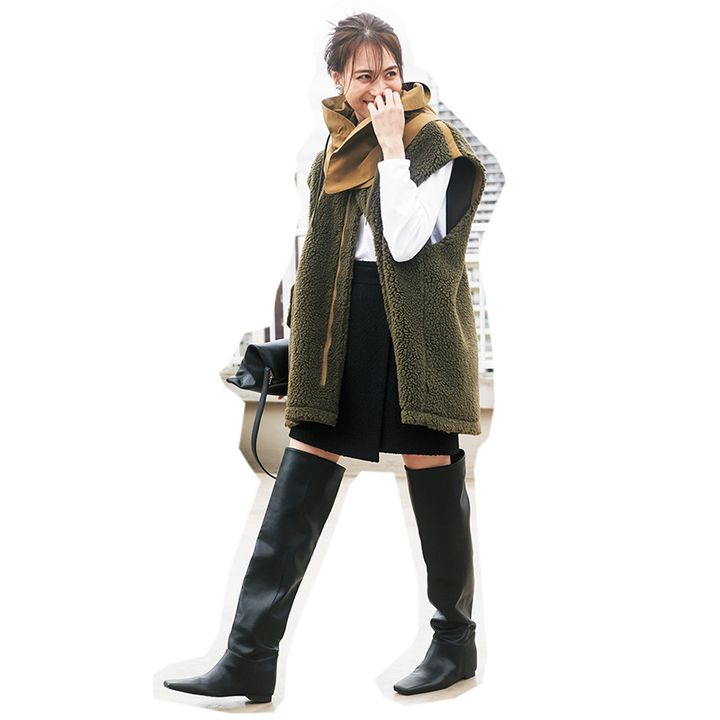 ニーハイブーツ[H1.5cm※インヒール除く]¥17,930(ミラ オーウェン/ミラ オーウェン ルミネ新宿2店)ボアベスト¥71,500(ヴァシュモン×カオス/Chaos GINZA SIX)カットソー¥12,100(マルティニーク/マルティニーク ルミネ横浜)ミニスカート¥18,700(アルページュストーリー)イヤリング¥14,300(イリス 47/フーブス)バングル¥13,750(エイチアッシュ/フォーティーン ショールーム)バッグ¥46,200(PUNTI./エルディスト)