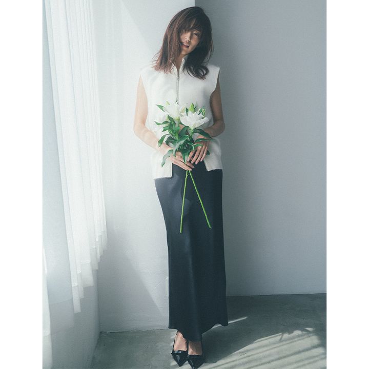 シャギーニットベスト¥17,600(ミースロエ)スカート¥27,500(サムソ サムソ/eight)パンプス¥6,590(ザラ/ザラ カスタマーサービス)