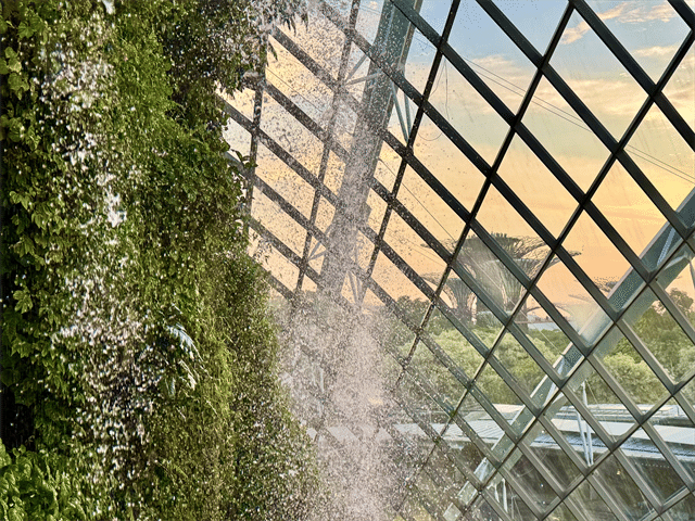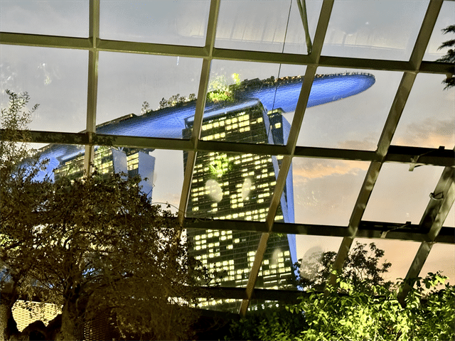 クラウド・フォレストとフラワードーム、2つの温室は全面ガラス張りとなっているので、夕暮れどきに訪れると美しさも倍増! ガラス越しに見える空の色がとてもきれいで、幻想的な雰囲気でした。