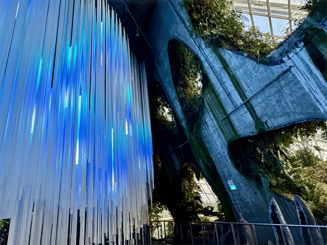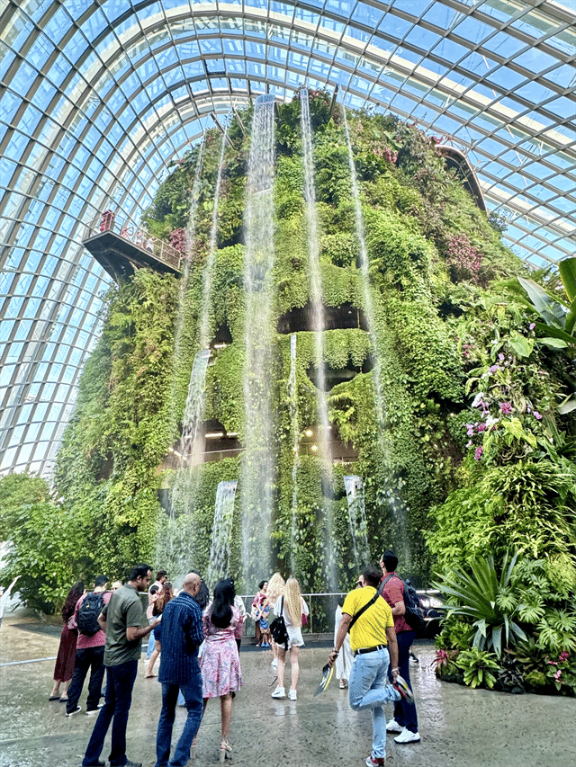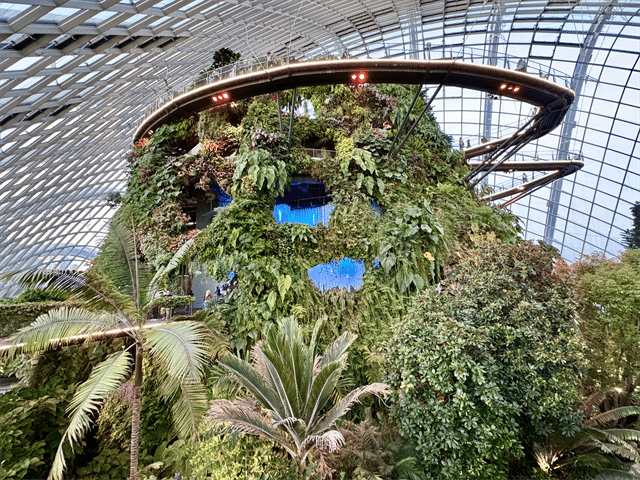 クラウド・フォレスト内に入ると、最初に目に飛び込んでくる滝は迫力満点。エレベーターで6階まで上がってから、散策路を歩いて山を下りるような設計になっています。