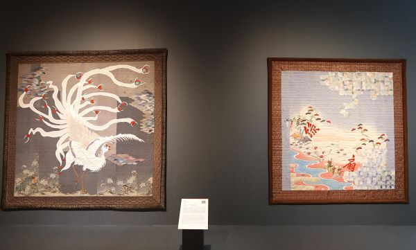 左から、八幡垣睦子 《鳳凰》 2023年 出雲キルト美術館蔵、八幡垣睦子 《悠久の舞》 2024年 個人蔵