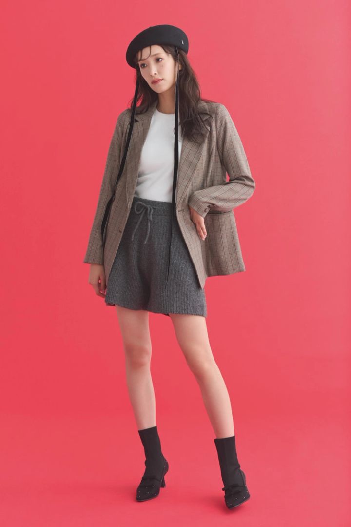 グレーニットハーフパンツ 9,900円/Ungrid チェックジャケット 11,000円/RESEXXY 白タンクトップ 5,390円/EMODA ルミネエスト新宿店 ベレー帽 22,000円/arth(OVERRIDE 神宮前)ブーツ 14,960円/RANDA