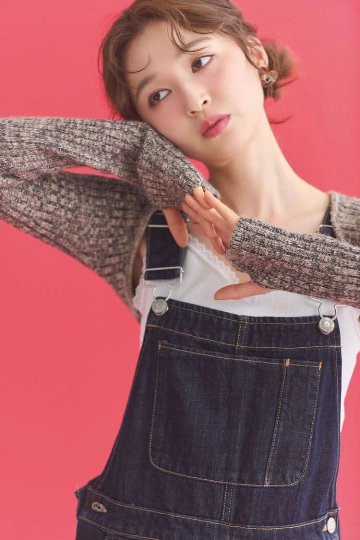ピタッとしたチビカーデと、ボリュームのあるボトムでメリハリ。カジュアルなサロペットも、野暮ったくならないすぐれもの。