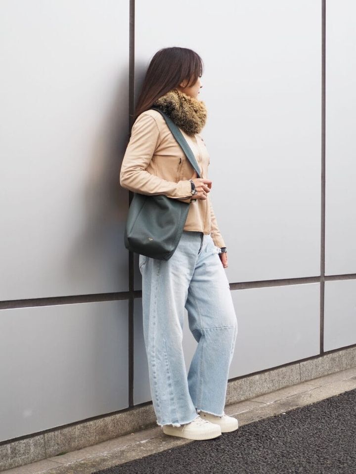 「シシ」の洗えるライダースジャケットは、8年ほど愛用しているSさんの冬の定番。ワイドシルエットのデニムを合わせ、メリハリのある着こなしに。「最初はもう少しピンクがかったジャケットだったのですが、経年変化でベージュっぽい色合いになってきました。これはこれで味があり、気に入っています」
