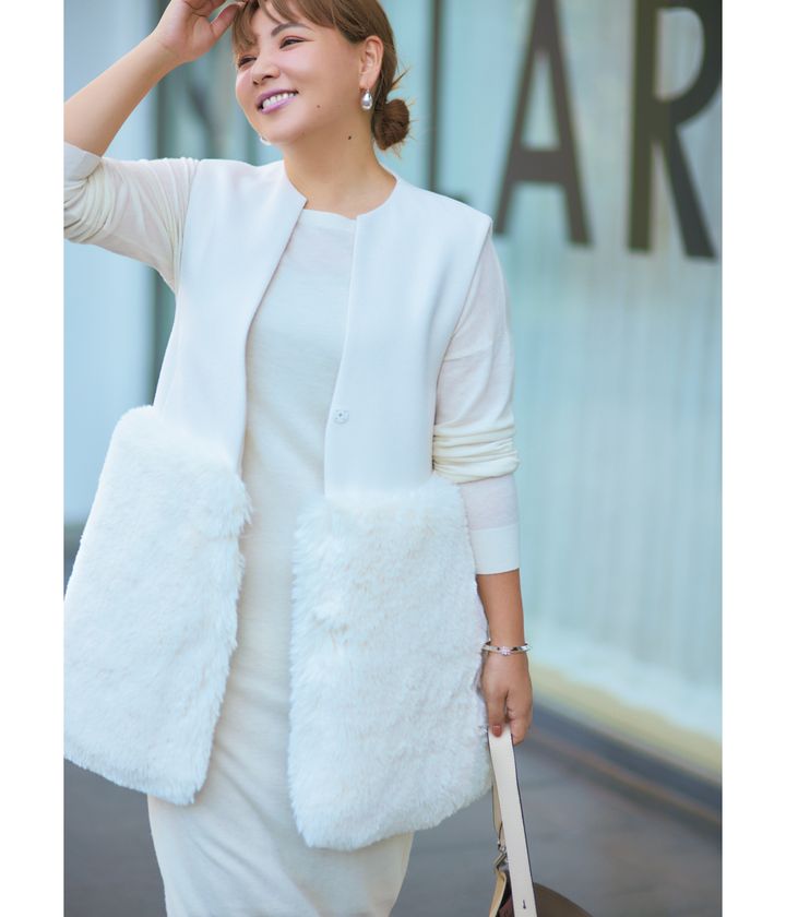 40歳を迎えた今、目指したいのは「品のある人」という野呂佳代さん。トレンドのジレを軸にした品格溢れる「オールホワイト」で憧れの女性像へ。上質なニットワンピースに、ファーをドッキングした華やかジレを纏えば仕草までエレガントに。