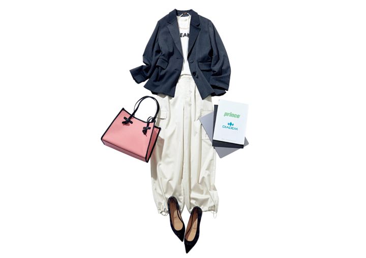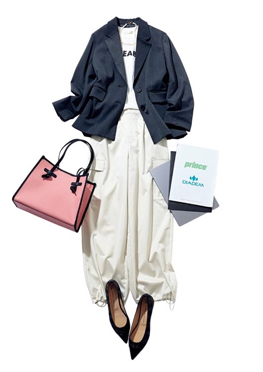 ジャケット¥37,400/カデュネ ロングTシャツ¥1,990/シューラルー(ワールド) カーゴパンツ¥22,000/Stola. ショルダーバッグ¥37,400/ジャンニ キアリーニ(ジャンニキアリーニ 銀座店) パンプス¥33,000/ファビオ ルスコーニ(伊勢丹新宿本店本館2階 婦人靴) パールネックレス¥10,780/Hh(フォーティーン ショールーム)