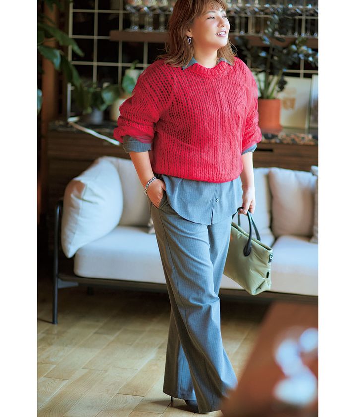 もともとマニッシュな感じは大好きだけど、体型が変化していくうち、カービィな体に直線的でハンサムな物を合わせると無理しているように思えてきて。2024年6月号「マシュマロ派は、甘ニッシュ(甘い×マニッシュ)が伸びしろ」企画で、甘い要素をプラスすればカーブさやまろやかさがセクシーさやドラマチックに振れることを学び、目から鱗。甘ニッシュこそ今の自分にフィットする、と思うと同時にスタイルのバリエーションが無限ということも実感できました!