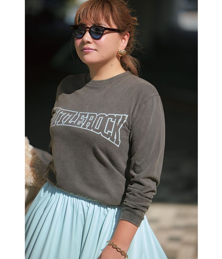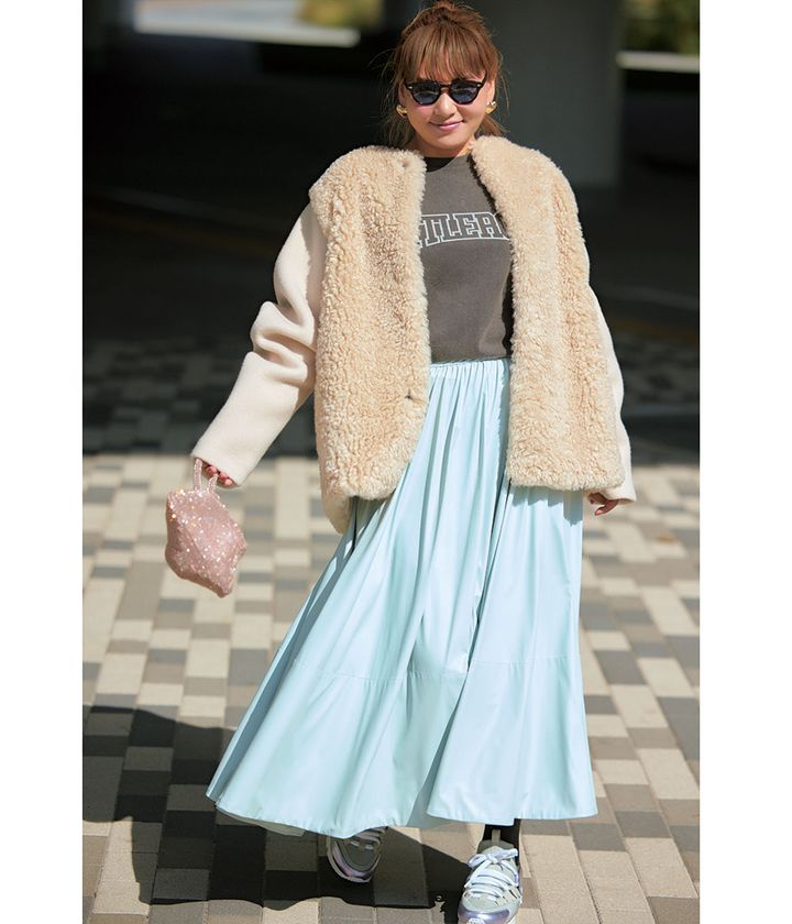 スカート¥39,600(アダワス/ショールーム セッション)ブルゾン¥82,500(ハイク/ボウルズ)カットソー¥13,200(ウィム ガゼット/ウィム ガゼット 青山店)バッグ¥8,690(カシュカシュ/アンビリオン)スニーカー¥111,100(ピエール アルディ/ピエール アルディ 東京)サングラス¥50,600(モスコット/モスコット トウキョウ)ピアス¥9,680(エティカ/ZUTTOHOLIC)タイツ(スタイリスト私物)