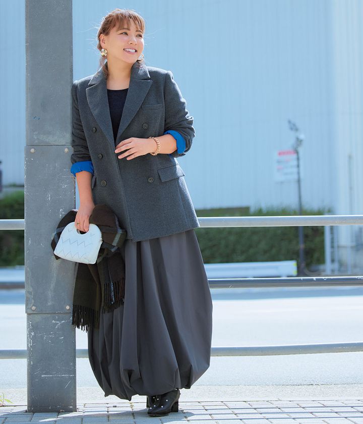 シックな大人モノトーンコーデもバルーンスカートで素敵な迫力に。ジャケット¥44,000(アルページュストーリーオリジナル)ニット¥16,500(カデュネ)スカート¥31,900(ナゴンスタンス)バッグ¥59,400(ペリーコ/アマン)ブーツ¥44,000(ツル バイ マリコ オイカワ)ストール¥93,500(ジョシュアエリス/グリニッジ ショールーム)ピアス¥9,240(ピルグリム/ZUTTOHOLIC)ブレスレット¥11,000(アビステ)リング¥51,700(スキャット/ロードス)