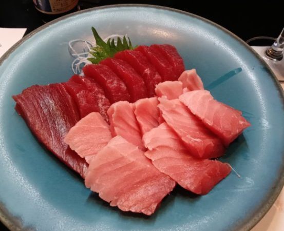 赤色が鮮やかでまぶしいくらいの赤身と中トロです。やっぱり鮪は食べたいですね。ここまででかなりのお刺身を食べたけれど日本人は鮪好き、待ってました~。2種盛りなのが贅沢ですね。両方のいいところを食べ比べながらこちらも完食、まぁ夫の方が多く食べていましたけど(笑)