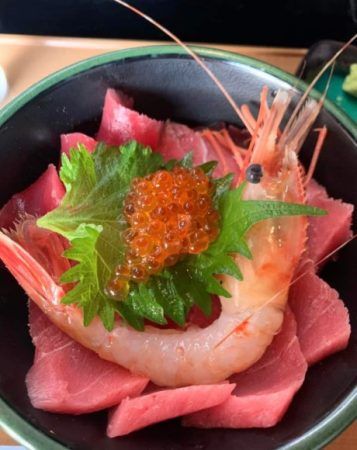 こちら、1年前の写真ですし、仕入れ状況で替わる生ものですから、あくまで参考程度に考えて見てください。こちら、宮城県産生メバチマグロ丼です。イクラとエビも乗っていますね。メバチマグロは三陸産のヒガシモノと言われているブランド品だそうです。