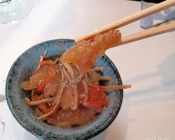先ずはお通しの松前漬け。写真でわかるでしょうか⁈大きな数の子が…。実はわたくし、数の子ってあまり得意ではないのです。でもこれは「美味しい~」下処理が違うのでしょうか…?生臭みが無く塩味が程よくて美味しく頂けました。