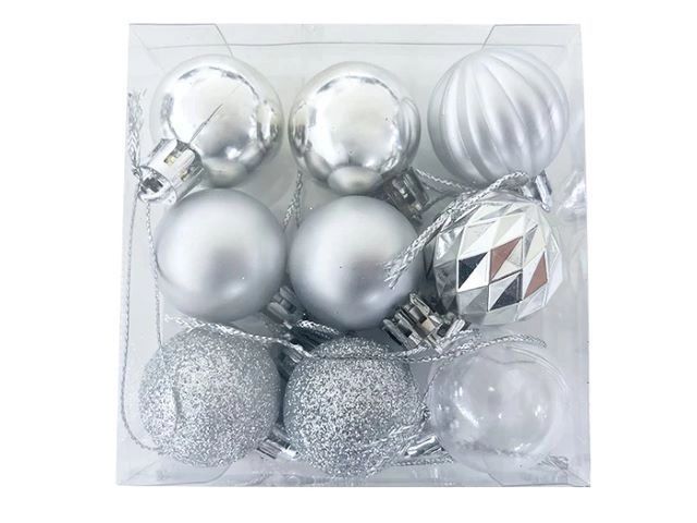 キラキラシルバーのオーナメントが9個入っている商品です。同色を使ったラメやマット、透明、カットのオーナメントボールなので、統一感のある飾り付けができますよ。