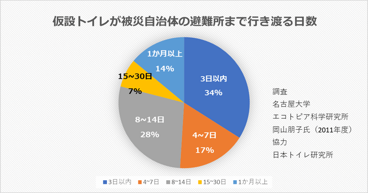 避難所のトイレと聞いて皆さんは何を想像しますか? 工事現場に設置してあるような個室型の仮設トイレでしょうか? 実は、東日本大震災で被災した自治体に「仮設トイレが避難所に行き渡るまでの日数」を尋ねたところ、「3日以内」と答えた自治体はわずか34%しかありませんでした。1か月以上かかったという自治体が14%にも上り、最長では65日以上かかりました。