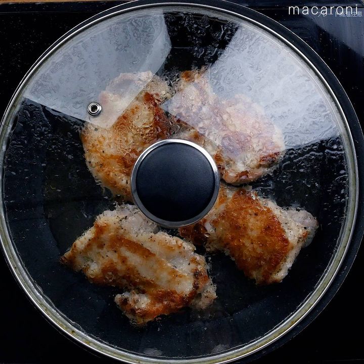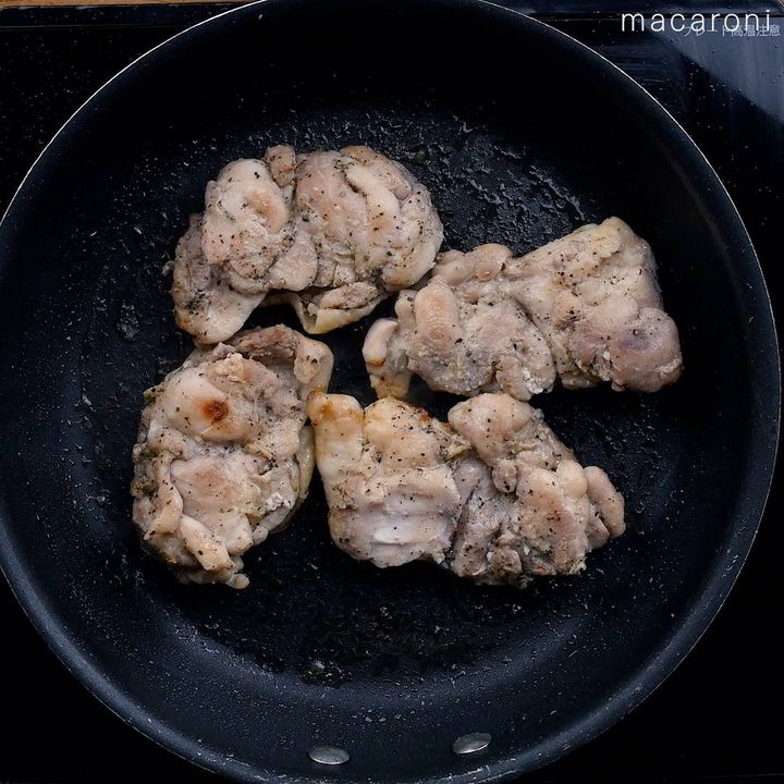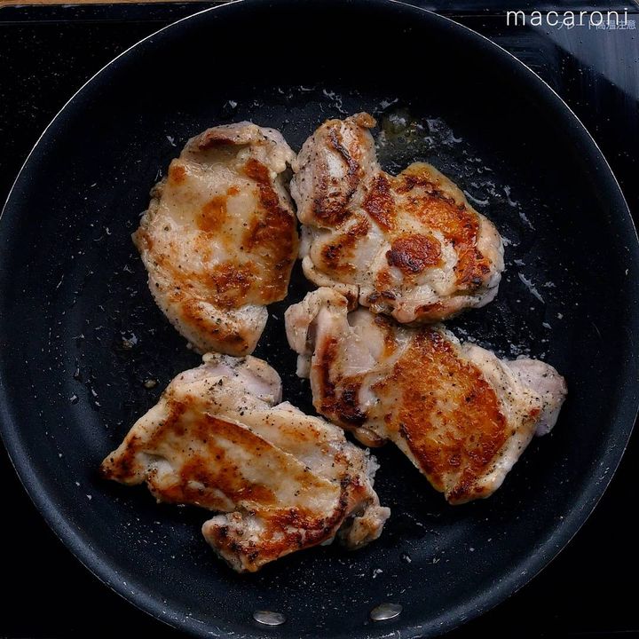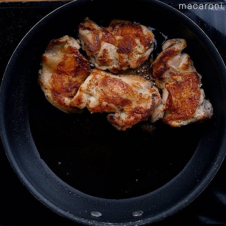 3: 鶏肉を押すように焼き、脂が出てきたら拭き取りながら、皮目がパリパリになるまでしっかり焼きます。