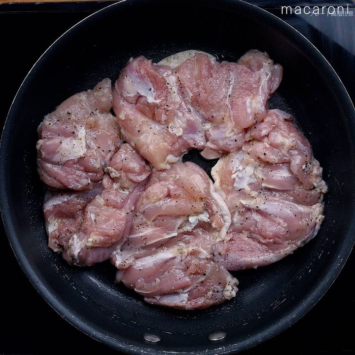 2: フライパンにサラダ油を引いて薄く伸ばし、①を皮目から並べ入れて弱中火にかけます。