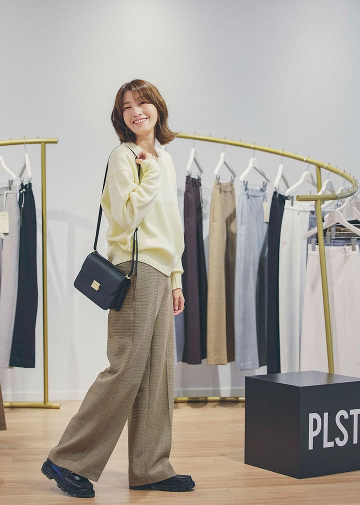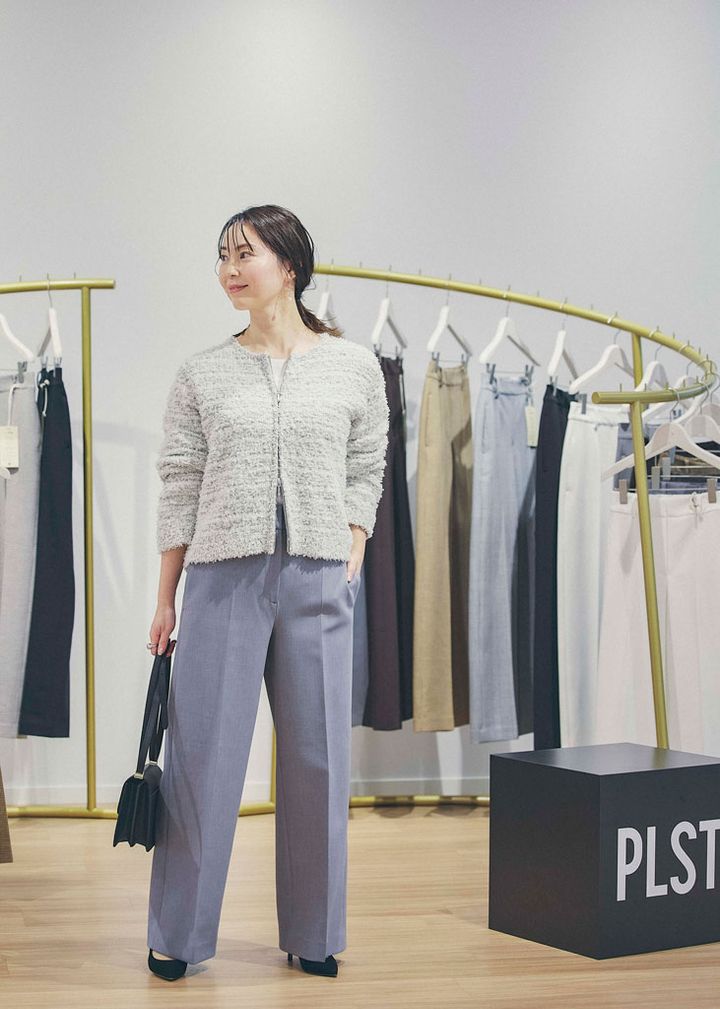 PLUS STYLEワイドパンツ(ウォームリザーブ)¥12,000※XSサイズ着用 マルチファンクションクルーネックTシャツ¥5,990※Lサイズ着用 ツイードライクジップアップカーディガン¥11,000※Lサイズ着用 コンパクトショルダバックー¥12,000(すべてプラステ)靴(私物)