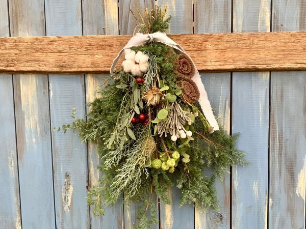 参加したワークショップで作成したクリスマススワッグ♪なかなか見本のようにはいきませんが…作る過程が楽しい~みんな違ってみんないい!