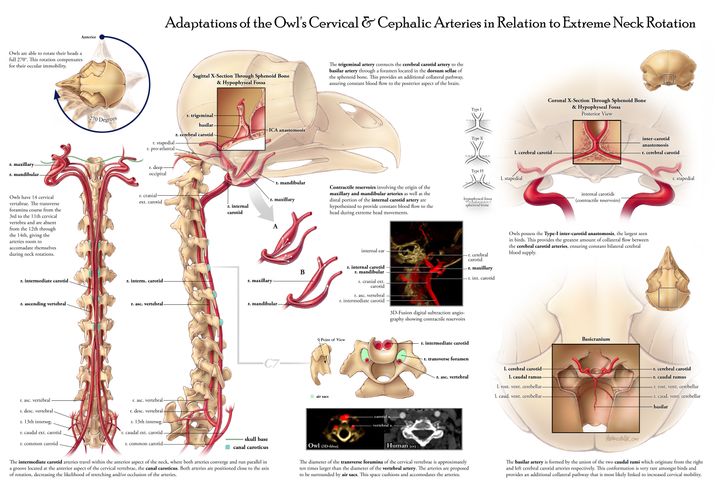 フクロウの頸骨と血管のイラスト / Credit:Johns Hopkins University, Science(2013)