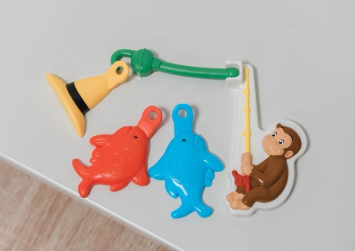 釣竿を使って、ジョージと釣りを楽しむことができる【ジョージのつりあそび】。魚などのフレームを水に浮かせて、釣り竿に引っかけて釣り上げる遊びです。