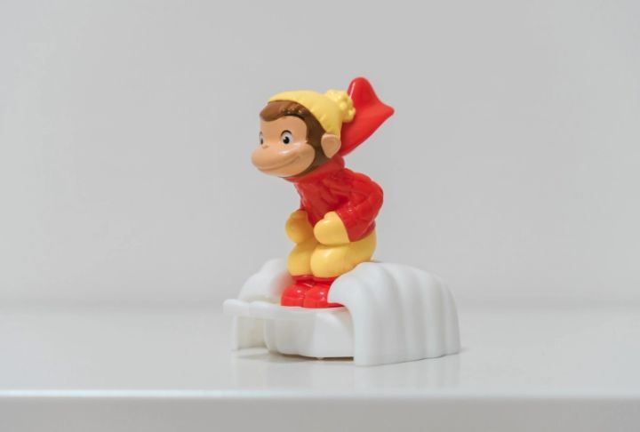 ハッピーセット「おさるのジョージ」は好奇心旺盛なジョージがモデル。第1弾はジョージと一緒に冬の遊びが楽しめる「とびだせ!ジョージのスキー」や「ジョージのそりあそび」、  第2弾はお風呂などで遊べる「ジョージのつりあそび」や「ジョージのゆきやまスライダー」など8種類と、ひみつのおもちゃ2種類の全10種類となっています。