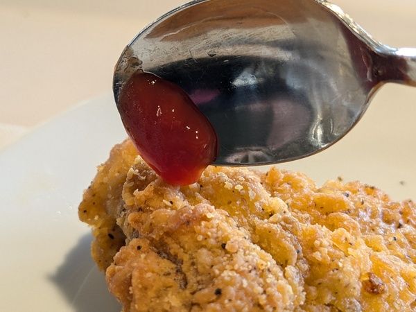フライドチキンはジューシーかつほどスパイスのきいた味わいが絶妙。店舗に設置されているケチャップを塗って食べても◎。