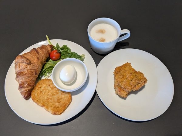 クロワッサン、ゆで卵、サラダにハッシュポテト、フライドチキン、ドリンクバーを選択。