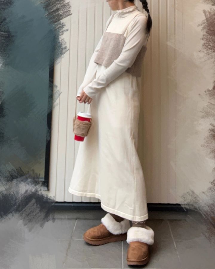 最初にご紹介するのは、@ao_piipiさんのワンピースとムートンスリッパを合わせたフェミニンコーデ。ブラウンのムートンスリッパは、ホワイトのワンピースとくすみベージュを組み合わせた淡色系コーディネートのアクセントに!スリッパのもこもこファーが優しげな印象を演出し、クリスマスのデートやお出かけにもぴったりです♡